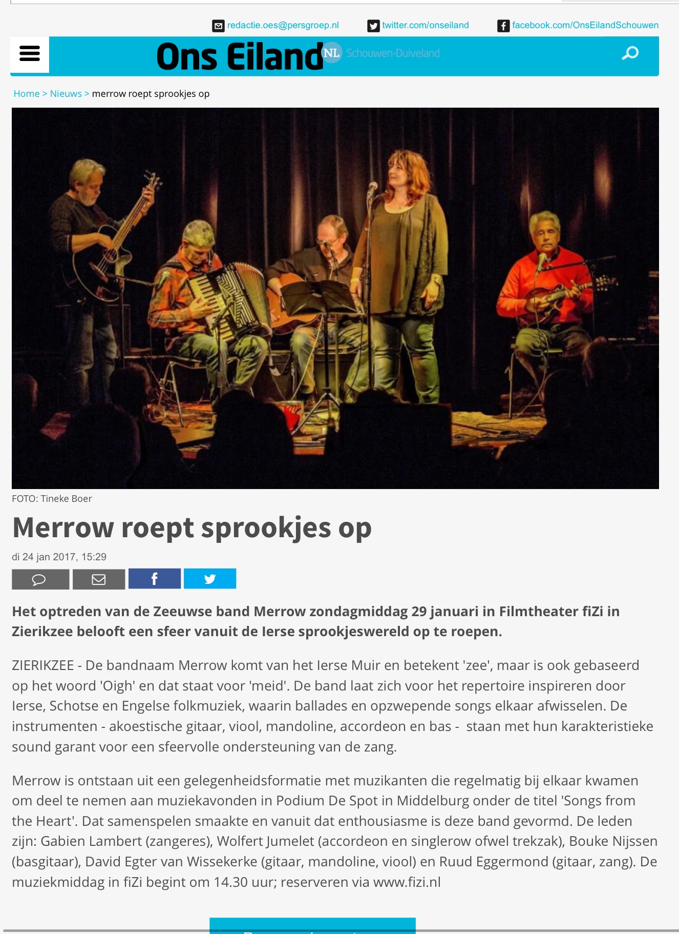 ZIERIKZEE ā Het optreden van de Zeeuwse band Merrow zondagmiddag 29 januari in Filmtheater fiZi in Zierikzee belooft een sfeer vanuit de Ierse sprookjeswereld op te gaan roepen. Ā De bandnaam Merrow komt van het Ierse Muir en betekent āzeeā, maar is ook gebaseerd op het woord āOighā en dat staat voor āmeidā.