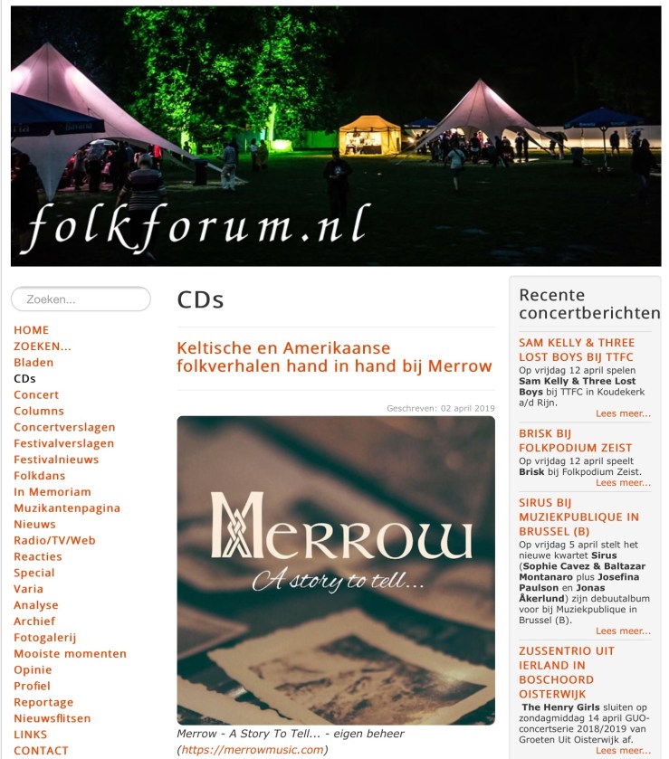De zang van Gabien Lambert is helder, de mannen hebben een warme stem die regelmatig doet denken aan Dubliners of Chieftains en de instrumentatie is dik in orde, klein akoestisch, maar soms ook uitbundig als het kan. A Story To Tell… doet hier en daar denken aan oude folkplaten uit de jaren ’60 en dat kan kloppen, want de opnames vonden volledig analoog plaats. Dat leidde ertoe dat Merrow anderhalf jaar aan deze cd heeft gewerkt, want je kunt niet zo gemakkelijk wat wegpoetsen als het verkeerd gaat, maar de noeste arbeid levert wel een fijne luisterplaat op met een heerlijk nostalgische charme die oudere folkliefhebbers zeker zullen herkennen.