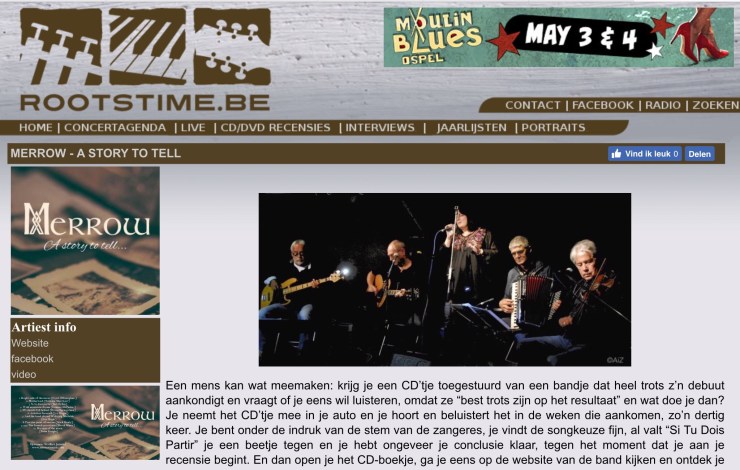 Het gebeurde kennelijk allemaal zo’n vier jaar geleden, toen de vijf van Merrow -hun naam haalden ze uit een Oud)Iers sprookje- in Middelburg bijeengebracht werden voor wat een eenmalig optreden zou gaan worden, maar dus resulteerde in een reis die nu al meer dan even duurt en voorlopig culmineert in deze -naar mijn gevoel- uitstekende CD. Geen van de vijf muzikanten was me voordien bekend en dus had ik geen mening over de zang van Gabien Borm-Lambert, die me nochtans meteen bij het nekvel had na nauwelijks twee lijnen “Motherland” van mijn favoriete nog levende zangeres Nathalie Merchant. Accordeon en hammond zijn in handen van Wolfert Jumelet, de bas berust bij Bouke Nijssen, Ruud Eggermont zingt en speelt gitaar, net als David Egter van Wissekerke, die daar ook nog viool en mandoline aan toevoegt. Over de instrumentale kwaliteiten kunnen we kort zijn: deze mensen weten hoe ze hun instrumenten moeten bespelen én hoe ze die het beste laten samenklinken.