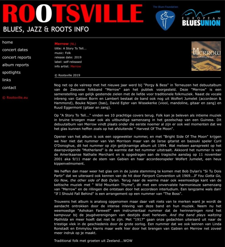 Nog net op de valreep met het nieuwe jaar werd bij “Porgy & Bess” in Terneuzen het debuutalbum van de Zeeuwse folkband “Merrow” aan het publiek voorgesteld. Deze “Merrow” is een samenstelling van gelijk gestemde zielen met de liefde voor traditionele folkmuziek. Naast de vocale inbreng van Gabien Borm en Lambert bestaat de band ook nog uit Wolfert Jumelet (accordeon & Hammond), Bouke Nijsen (bas), David Egter van Wissekerke (viool, mandoline, gitaar en zang) en Ruud Eggermont (gitaar en zang).