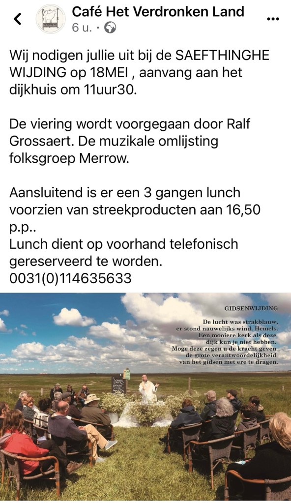 Op 18 mei 2024 om 11.30 uur vindt de wijding van de Saeftinghe gidsen plaats tijdens een dienst in het dijkhuis, geleid door Ralf Grossert en met muzikale bijdrage van Merrow. Na de dienst wordt een drie gangen lunch aangeboden voor €16,50 door de streekhouders. Graag voor de lunch vooraf aanmelden via mail, telefoon ( 0031(0) 114 635633) of in het café. Later zal er in en rondom het café muziek van Merrow te beluisteren zijn.