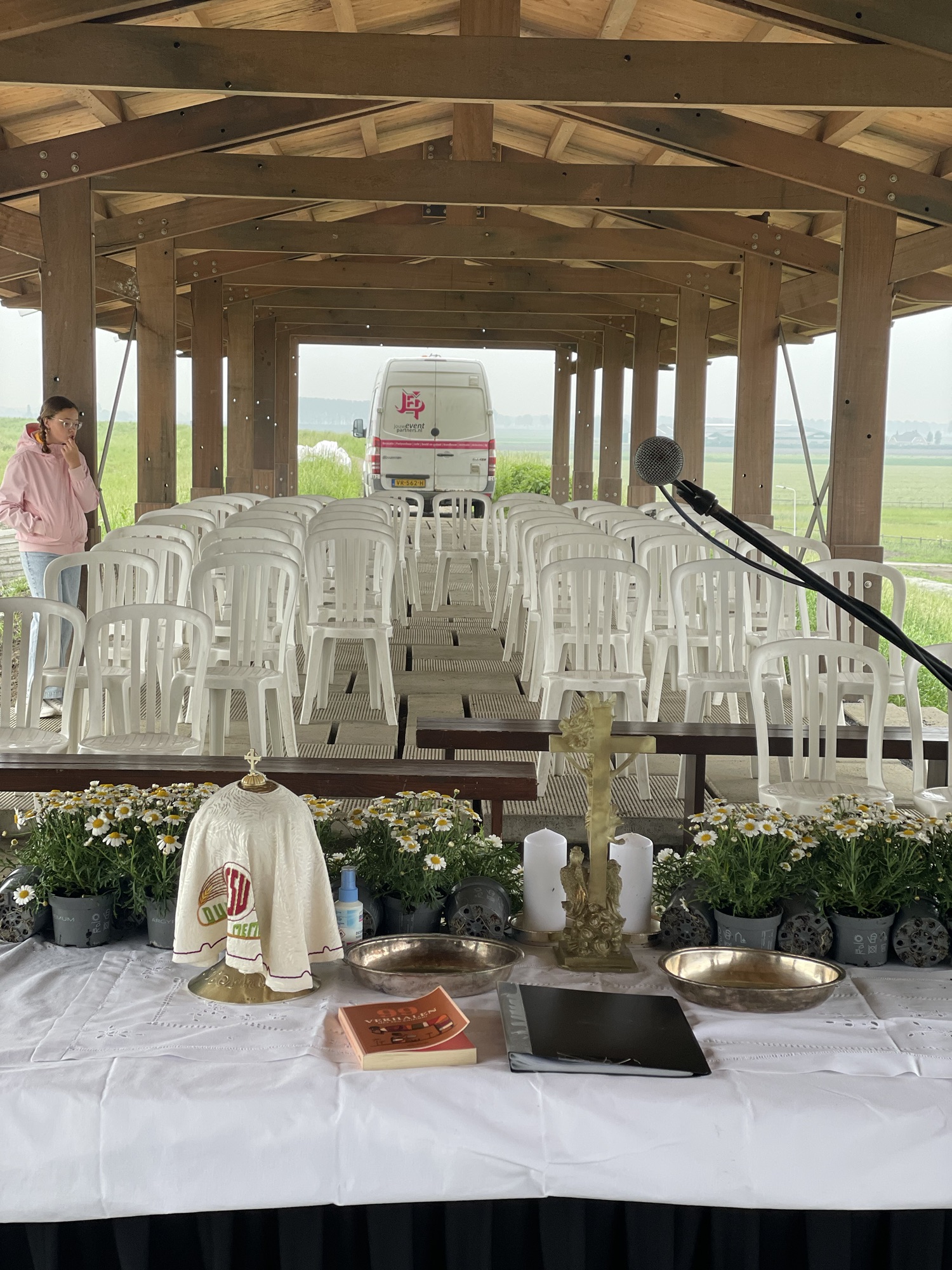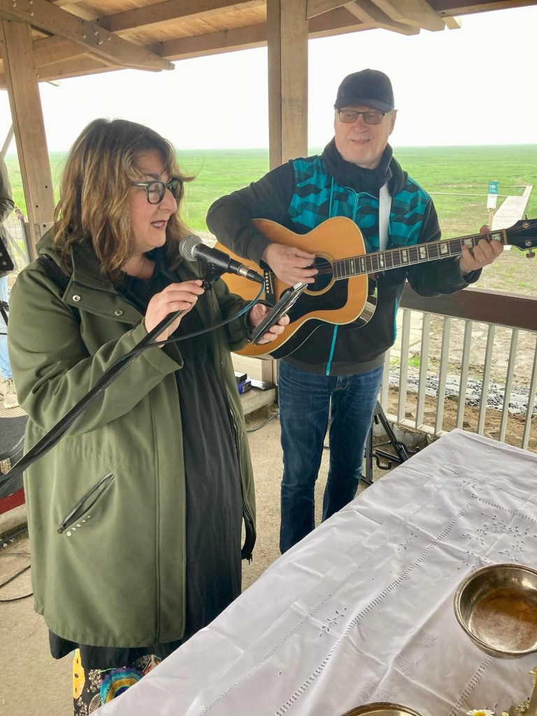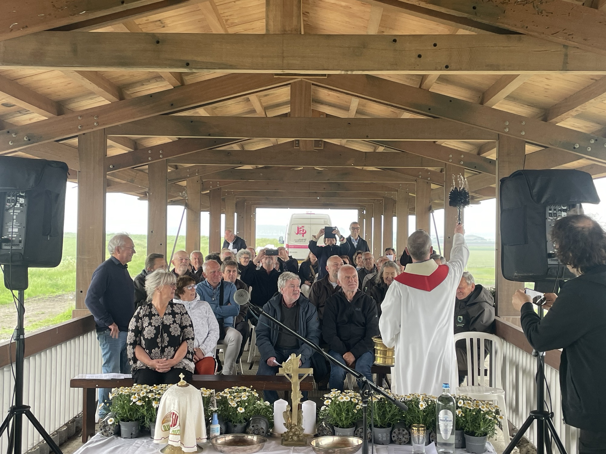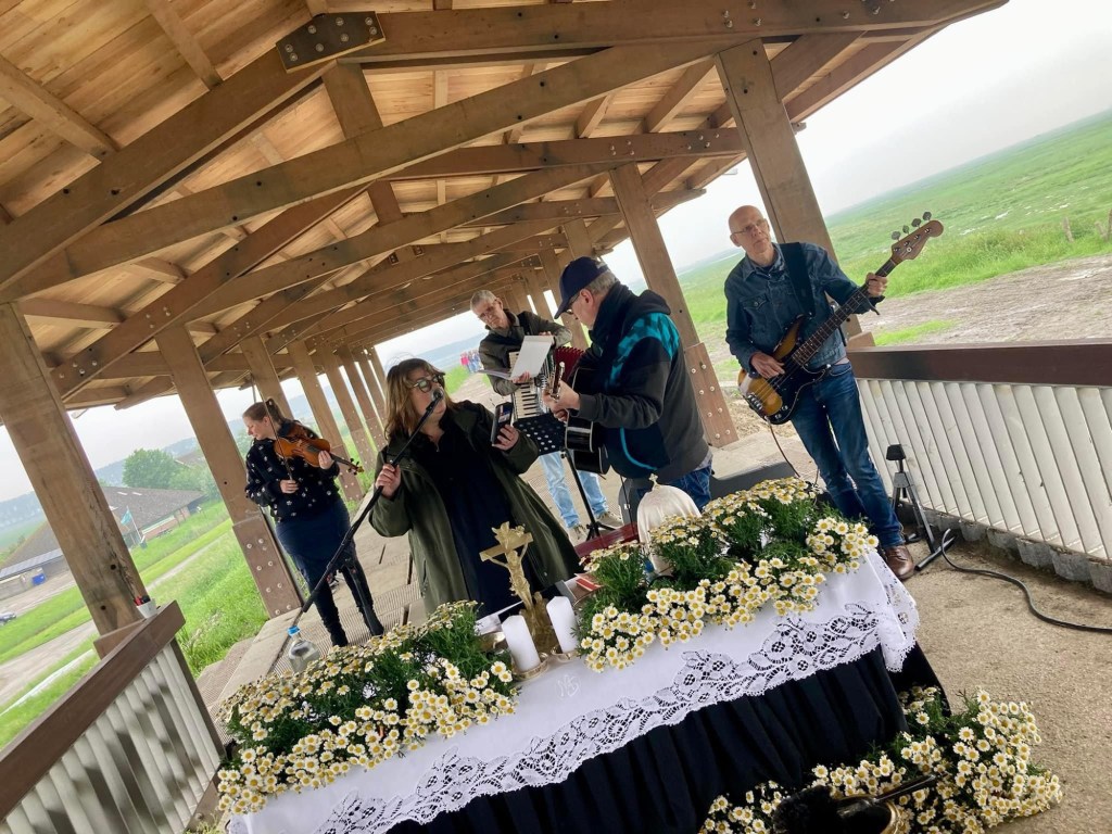 Wat een geslaagde dag! Het begon met de Wijdingsdienst bovenop de dijk, waar pastoor Ralf Grossert de aanwezige gidsen zegende om hen te beschermen tijdens hun werk in en rond het land van Saeftinghe. Dank je wel, Patrick Roelands van JEP, voor de versterking bovenop de dijk! Met de aanwezige wind was dat zeker geen overbodige luxe. Daarna was er eten, drinken en muziek onder de overkapping van het altijd gezellige café van Gina. Bedankt voor de uitnodiging: We hebben enorm genoten; het was heel speciaal!